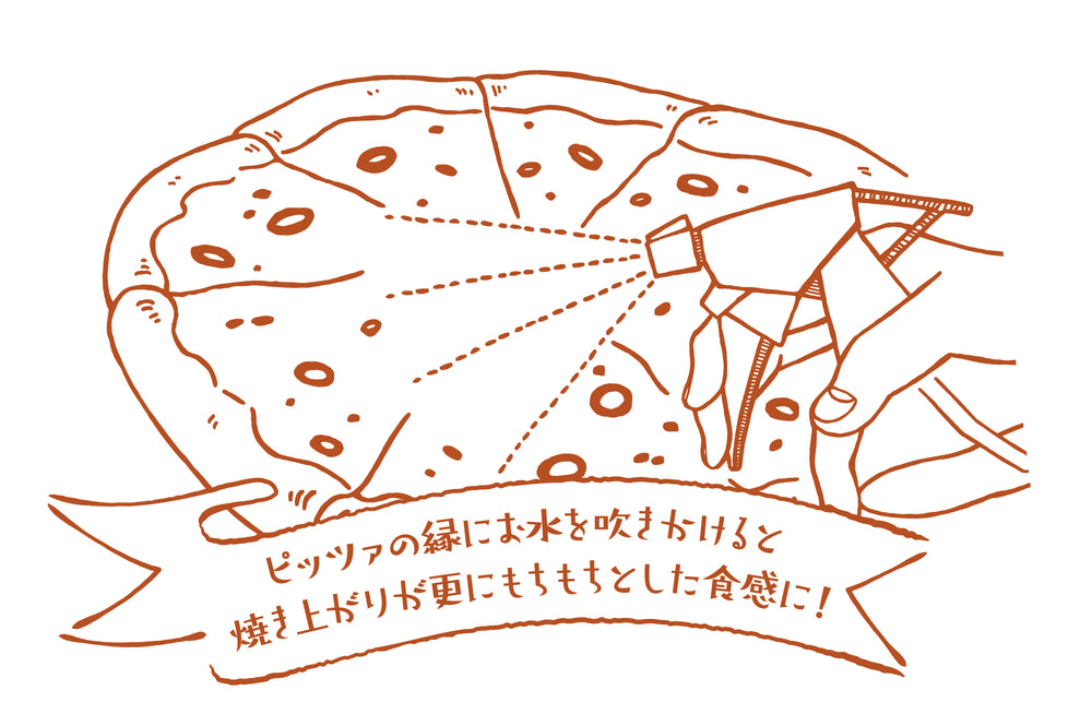 フライパンにのせる前に、ピッツァの耳の縁に少しお水を吹きかけると、焼き上がりがモチモチになります。